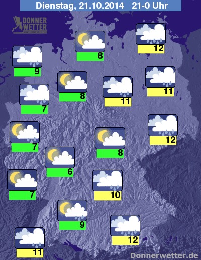 Am Abend hält das windige und teils stürmische Wetter weiter an, dabei lockert die Bewölkung in der Westhälfte des Landes meist auf und es fällt nur noch selten Regen, sonst bleibt die Wolkendecke dagegen meist geschlossen und es fällt noch teils kräftiger Regen. Der Wind weht meist mäßig bis frisch, gebietsweise aber auch stark mit zum Teil stürmsichen Böen, in den Bergen und an der See auch mit möglichen Sturmböen. Die Temperatur sinkt auf 12 Grad in Landshut und bis 6 Grad am Westerwald.