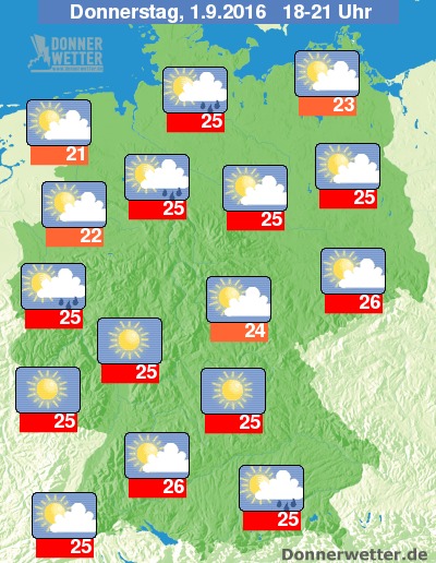 Heute Abend ist der Himmel über dem Land zum weitaus größten Teil nur locker bewölkt oder sonnig. Gebietsweise dichte Wolken mit einzelnen Schauern sind jedoch insbesonders im Alpenvorland, jedoch auch von NRW bis nach Niedersachsen zu erwarten. An den Alpen sind zudem örtliche Gewitter möglich, sonst bleibt es bundesweit trocken. Die Temperatur liegt bei 21 Grad in Ostfriesland und um 26 Grad in Karlsruhe.