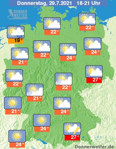 Heute Abend sind im Umfeld der Nordsee und auch der Alpen gebietsweise dichte Quellwolken möglich, die hier zu Schauern und auch zu Gewittern führen können. Im übrigen Bundesgebiet ist es aber zumeist heiter bis sonnig, teils auch aufgelockert bewölkt und dazu trocken. Die Temperatur liegt bei 19 Grad in Cuxhaven und bis 27 Grad in München.