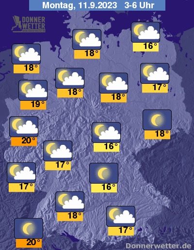 In der bevorstehenden Nacht ist es im Süden und Osten noch oft sternenklar, sonst zieht allerdings auch verbreitet leichte Bewölkung durch, dazu bleibt es aber trocken. Die Temperatur sinkt auf tropische 20 Grad in Freiburg und bis 16 Grad in Neubrandenburg.