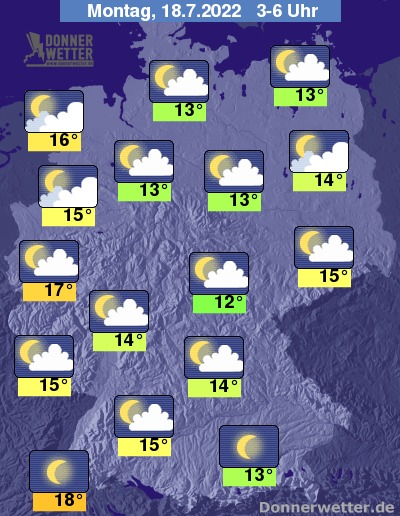 In der bevorstehenden Nacht halten sich im Nordwesten und gebietsweise über dem Osten einige, teils dichte Wolken. Im übrigen Land ist der Himmel meist locker bewölkt, vor allem im Süden auch sternenklar. Es bleibt landesweit trocken bei Tiefstwerten von 18 Grad im Oberrheingraben und 12 Grad im Grabfeld.