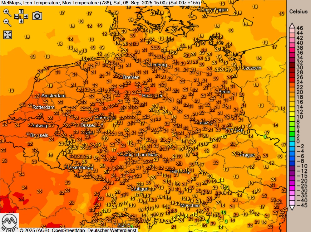 Angenehme Spätsommerwerte um 20 bis 25 Grad.