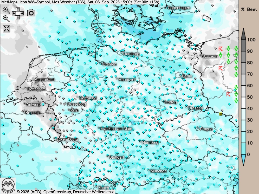 Die Temperatur- und Wetterkarte für Samstagnachmittag (15:00 Uhr) nach ICON: