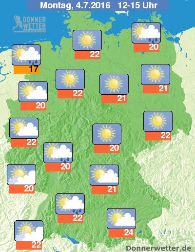 Die Temperaturen erreichen Werte um 17 Grad C in Emden und um 24 Grad C am Alpenrand.