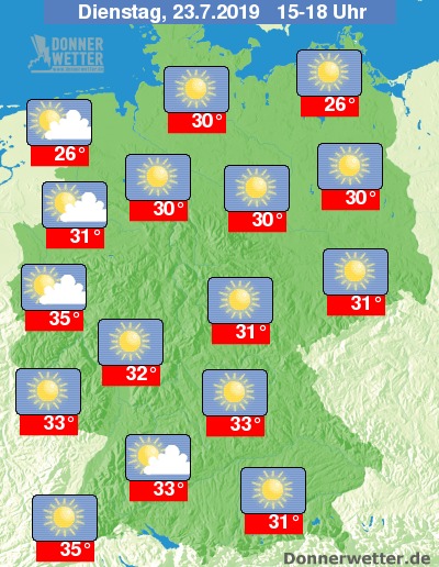 Die Temperaturen steigen im Laufe des Nachmittags noch etwas an und überschreiten in den Ballungsgebieten des Westens, sowie im Breisgau stellenweise die 35 Grad - Marke.