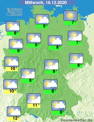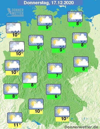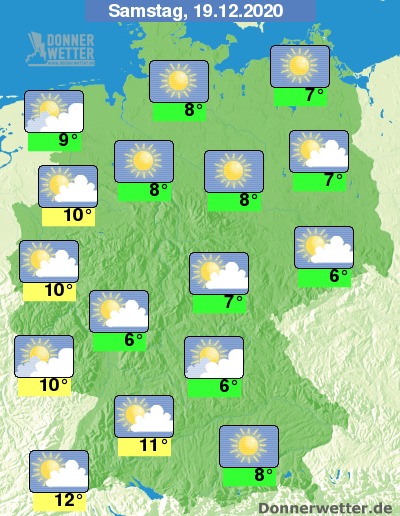 Nach Auflösung lokaler Nebel- und Hochnebelfeldern häufig freundlich im Osten und Süden auch zum Teil längere Zeit sonnig und trocken.