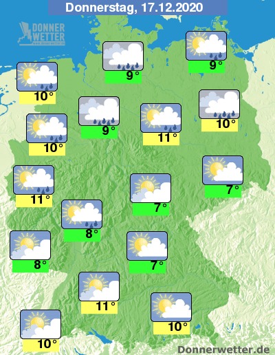 Über den Westen und Norden schwenken kompakte Wolken mit Regen hinweg. Im Osten und Süden überwiegt nach teils zäher Nebelauflösung freundliches Wetter mit einigen größeren Aufheiterungen.