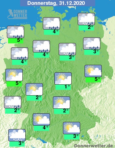 Sowohl im Norden und dort wo Frankreich nahe ist fällt am Silvestertag teilweise Regen oder Schneeregen, im Schwarzwald und im Hunsrück auch Schnee. In den anderen Gebieten wechseln sich Wolken mit gelegentlichen Sonnenstrahlen ab.
