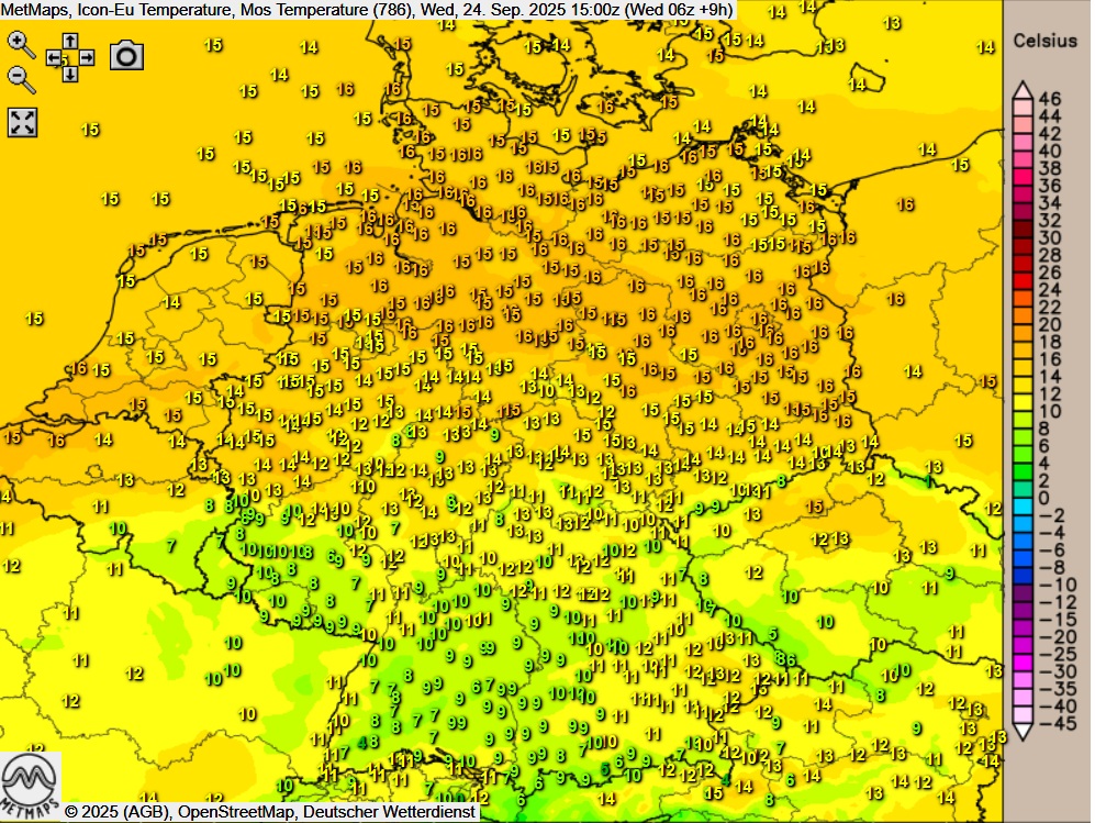 Über der Südhälfte bleibt der Himmel am Nachnmittag bedeckt, dabei fällt im Süden und Südwesten kräftiger und teils anhaltender Regen. Lokal besteht Unwettergefahr.