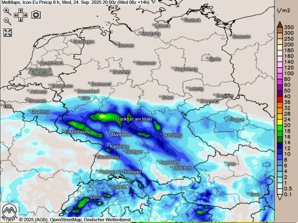 Die Lufttemperaturen am Mittwochnachmittag und die Sechs-Stunden-Regenmengen bis 20:00 Uhr nach Icon-Eu: