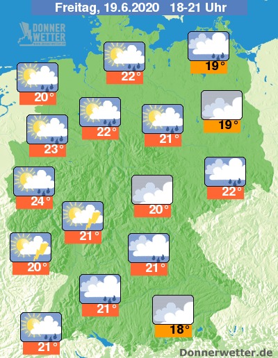 Am Abend bleibt der Himmel im Osten und Süden meist stark bewölkt oder bedeckt und es kann gebietsweise noch tröpfeln. Im Westen und Nordwesten gibt es neben mächtigeren Haufenwolken mit örtlichen Regengüssen und Gewittern auch kurze Aufheiterungen.