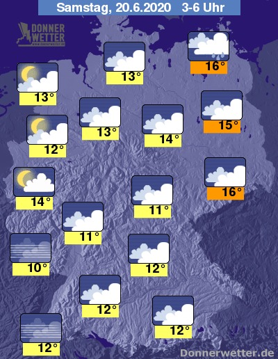 In der Nacht lassen Regen und Schauer bis auf regionale Ausnahmen nach, der Himmel bleibt aber in der Regel von Wolken überzogen. Besonders vom Rheinland bis zur Nordsee klart der Himmel gelegentlich mal auf, so dass die Sterne zu sehen sind. Im Südwesten können sich stellenweise Nebelfelder bilden.