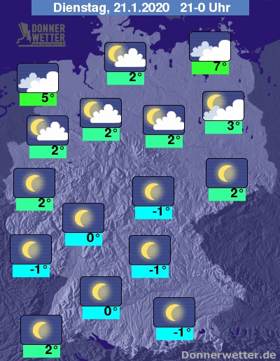 Bis Mitternacht dringen die Wolken etwas weiter bis in die Norddeutsche Tiefebene vor, in der Südhälfte bleibt es mit Ausnahme sich bildender Nebelfelder nahezu wolkenlos.