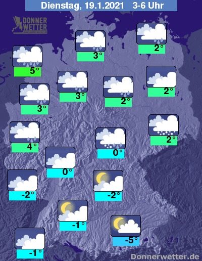 In der Nacht auf Dienstag bleibt der Himmel abseits von einzelnen Auflockerungen an der Nordseeküste sowie in Süddeutschland bedeckt. Dabei muss vor allem in der Nordhälfte des Landes immer wieder mit Schauern gerechnet werden, die meist als Regen, oberhalb von 600 m auch als Schnee fallen können. Im Süden bleibt es meist trocken. Der Wind weht meist mäßig, an den Küsten sowie auf den Gipfeln sind auch einzelne stürmische Böen möglich.