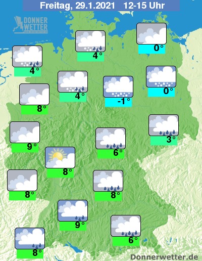 Am frühen Nachmittag kann es im Bereich der Luftmassengrenze über Norddeutschland stärkeren Schneefall oder Schneeregen geben. Vor allem auf etwas höher gelegenen Straßen muss mit teils erheblicher Glätte gerechnet werden. Direkt an der Ostsee bleibt es vorwiegend trocken. Im übrigen Land zieht ein Regengebiet nach Osten. Dahinter lockert die Wolkendecke vorübergehend etwas auf.