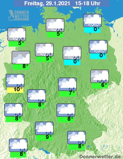 Die Temperaturen bewegen sich im Norden und Nordosten zwischen 0 und 4 Grad, in den nördlichen Mittelgebirgen bleibt es bei leichtem Frost. In den anderen Gebieten werden milde 5 bis 10 Grad erreicht.