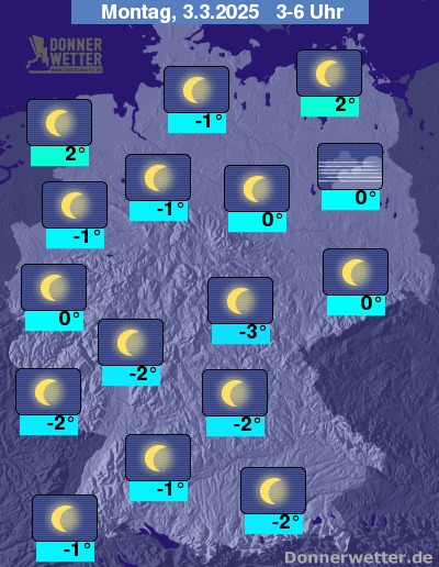 Die Temperaturen gehen in den frühen Morgenstunden zurück auf Werte um 2 Grad in Küstennähe und -3 Grad in Oberfranken.