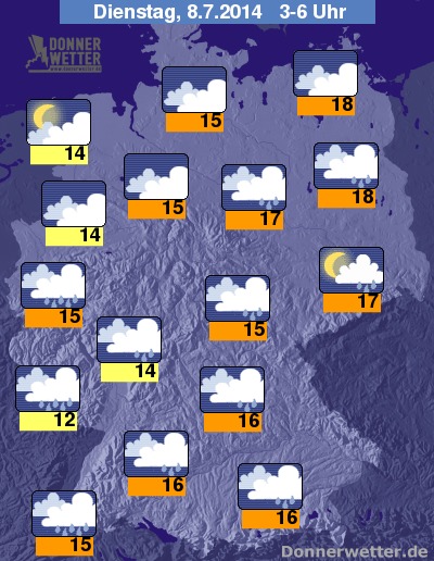 Am morgigen Dienstag kann sich bei meist dichter Bewölkung meist nur selten die Sonne zeigen. Vor allem nach Norden und Osten bilden sich oft Schauer und Gewitter. Nach Westen und Süden ist es meist sehr regnerisch und mit 15 bis 20 Grad deutlich kühler als im Nordosten, hier werden nämlich schwülwarme 24 bis 28 Grad erreicht. Es können in der Südhälfte im Laufe des Tages unwetterartige Regenmengen zusammen kommen, so dass Überschwemmungen möglich sind!