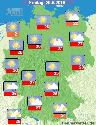 Südlich des Mains dominieren zunächst die Wolken. Später kommt gelegentlich die Sonne hervor. Im weiteren Verlauf entwickeln sich im Süden mächtigere Haufenwolken, die örtliche Schauer und Gewitter produzieren. Im übrigen Land scheint verbreitet die Sonne von einem meist blauen Himmel. Lediglich über Mecklenburg-Vorpommern und Brandenburg ziehen im Tagesverlauf Schleierwolken hinweg. Die Höchsttemperaturen liegen allgemein zwischen 22 und 29 Grad. An den Küsten, sowie auf den Mittelgebirgen bleibt es kühler. Der Nord- bis Nordostwind kann gebietsweise böig auffrischen.