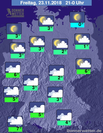 Bis zu den Frühstunden gehen die Temperaturen im Nordosten, sowie im Thüringer Becken zum Teil in den leichten Frostbereich zurück. Im übrigen Bereich liegen die Werte zwischen 1 und 6 Grad. Am mildesten bleibt es dabei unter den Regenwolken.