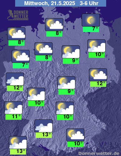 Die Temperaturen gehen in den frühen Morgenstunden zurück auf Werte um 13 bis 7 Grad.