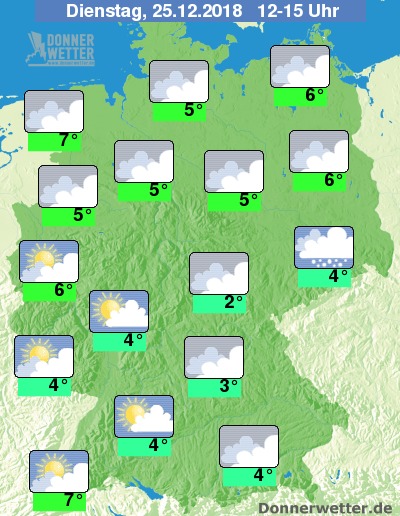 Am Nachmittag des ersten Weihnachtsfeiertags fällt über dem Erzgebirge noch etwas Schnee, im Flachland auch Regen oder Schneeregen. Sonst halten sich dichtere Wolken am Himmel, doch sollte es trocken bleiben. Nach Südwesten hin gibt es einige größere Aufheiterungen für die Sonne.