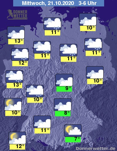 Bis zu den Frühstunden kühlt die Luft auf 6 bis 11 Grad ab, milder bleibt es vom Mittelrhein bis zur Emsmündung, sowie im Markgräflerland.