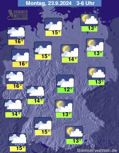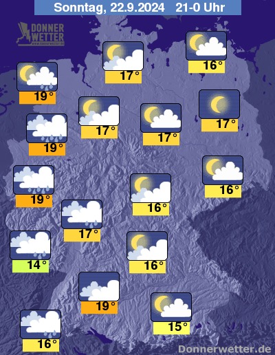 In der Nacht zum Montag greift die Bewölkung von Westen her auch auf die mittleren Landesteile über und es muss mit teils schauerartigem Regen gerechnet werden, auch einzelne Gewitter sind möglich. Im Osten und Nordosten bleibt es bei sternenklarem Himmel oder nur geringer Bewölkung trocken.