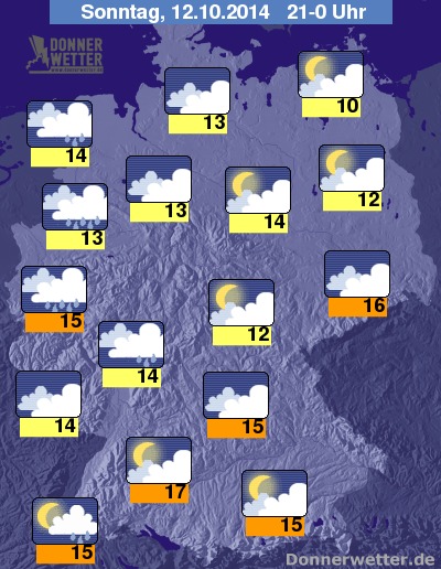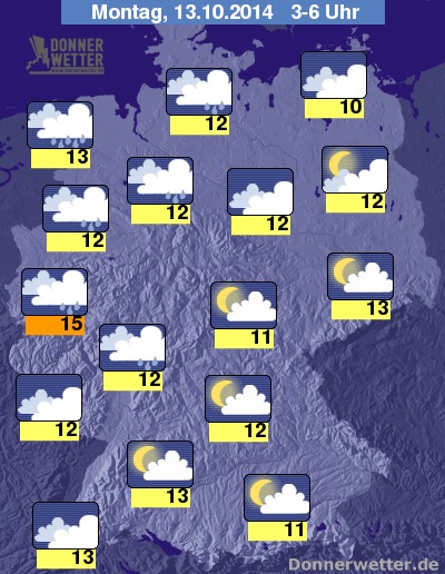 In der Nacht zum Montag breiten sich die Regenwolken auch in den Norden des Landes aus, in der Südosthälfte Deutschlands ist es dagegen aufgelockert bis stark bewölkt und es bleibt trocken. Stellenweise bildet sich Nebel oder Dunst. Die Temperatur sinkt auf teils 15 Grad im Rheinland uns bis 10 Grad um Neubrandenburg.