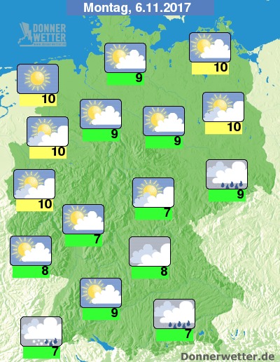 Am Montag bleibt es vornehmlich im Süden und über Sachsen weitgehend wolkenverhangen und es fällt hier und da, besonders jedoch im Südosten zeitweise Regen. In Richtung Nordwesten werden die Wolkenlücken jedoch immer größer und im Norden und Westen ist es auch oft heiter, zum Teil sogar sonnig, dabei bleibt es trocken. Die Temperatur erreicht 7 bis 10 Grad.