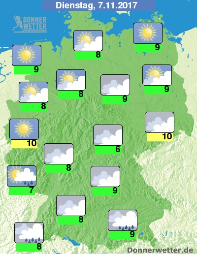 Am Dienstag zeigt sich der Norden und Westen häufig heiter bis sonnig, teils ziehen hier auch dichtere Wolken durch, dazu bleibt es trocken. Über der Südosthälfte bleibt es meist bedeckt und es fällt vereinzelt auch etwas Regen, am Alpenrand fällt zeitweise Regen. Die Temperatur steigt auf 6 bis 10 Grad.