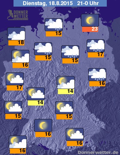 In den Abendstunden des Dienstags hält das Wetter soweit in den meisten Regionen an. Die Tiefswerte liegen bei 23 Grad C bis 14 Grad C.
