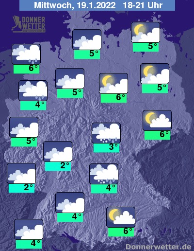 Heute Abend ist es im Süden und anfangs auch im Osten noch gebietsweise aufgelockert bewölkt und dazu auch noch trocken. Im großen Rest der Republik ziehen dichte Wolken durch und es setzt vielerorts Regen, über der Landesmitte anfangs auch Schneefall ein. Die Temperatur liegt bei 2 Grad am Westerwald und bis 6 Grad an der Nordsee. Der Wind weht im Norden zunehmend stark, an den Küsten ist es verbreitet stürmisch.