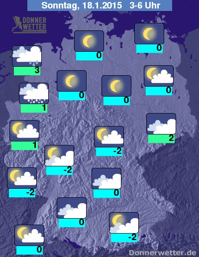 In der Nacht zum Sonntag fällt anfangs im Osten und Süden noch zeitweise Schnee, Schneeregen oder Regen, dabei kann es stellenweise glatt auf den Straßen sein. Nach Mitternacht klingen die Niederschläge hier jedoch nach und nach ab und teils lockert die Bewölkung auch etwas auf. In den anderen Landesteilen ist es dagegen häufig sternenklar oder nur locker bewölkt und trocken, in der zweiten Nachthälfte ziehen jedoch im Nordwesten des Landes dichte Wolken mit zeitweiligem Schnee, Schneeregen oder Schnee auf, dabei kann es ebenfalls teils sehr glatt werden. Die Temperatur sinkt auf 3 Grad an der Nordsee und bis -2 Grad am Alpenrand.
