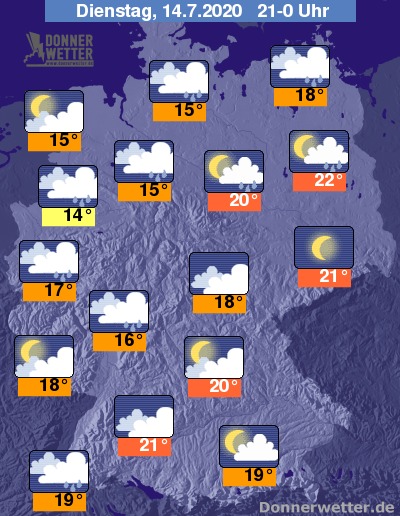 Bis Mitternacht bleibt es in der Nordwesthälfte wechselnd wolkig bis stärker bewölkt mit weiteren Regengüssen, die aber meist nur regional auftreten. In der Südosthälfte wechseln sich Wolken mit Halbmond und Sternen ab und es bleibt hier eher trocken.