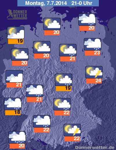 Am Abend bilden sich in der Südosthälfte weitere Schauer und auch mögliche Gewitter. Im Nordwesten bleibt es bei aufgelockerter Bewölkung dagegen weitgehend trocken. Die Abendtemperaturen liegen bei 24 Grad in Dresden und 18 Grad im Hunsrück.