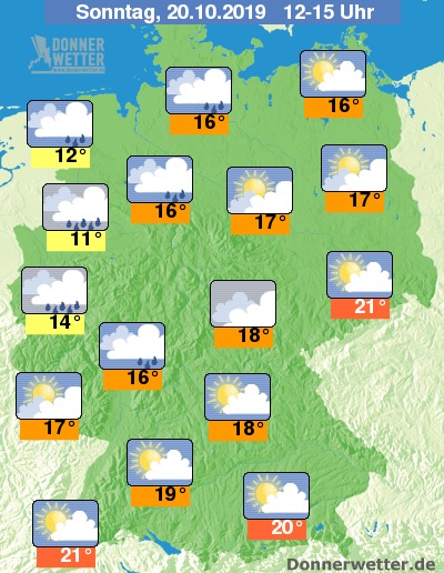 Heute Nachmittag ist es im Westen und Nordwesten, am Nachmittag auch über dem Norden Deutschlands bedeckt und es fällt zeitweise Regen, im übrigen Bundesgebiet ist es verbreitet locker bis stark bewölkt und dabei trocken. Die Temperatur liegt bei 11 Grad im Münsterland und bis zu 21 Grad im Breisgau.