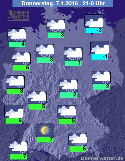 Heute Abend kann es im Südwesten Deutschlands gebietsweise aufklaren, im großen Rest des Landes bleibt es hingegen bei einer weitgehend geschlossenen Wolkendecke und über der Südwesthälfte fällt immer wieder Regen, nordöstlich eines Streifens von der Nordsee bis zum Erzgebirge fällt oft Regen, Schneeregen, Schnee und teils auch gefrierender Regen, dazu besteht erhöhte Glättegefahr! Im Nordosten bleibt es bis Mitternacht noch meist trocken. Die Abendtemperatur liegt bei 8 Grad in Düsseldorf und -3 Grad in Vorpommern. Im Norden und Westen weht teils starker Wind, an den Küsten und auf den Bergen ein teils stürmsicher Wind.