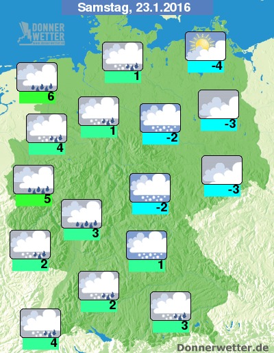 Am Samstag überwiegend bereist zu Beginn weitgehend dichte Wolken, dabei zieht von Westen her Schnee, Schneeregen und teils gefrierender Regen auf, dazu ist mit erheblicher Glättegefahr zu rechnen!!! Im weiteren Verlauf gehen die Niederschläge in den westlichen Landesteilen in Regen über. Es werden -4 Grad in Vorpommern und bis 5 Grad im Rheinland erreicht.