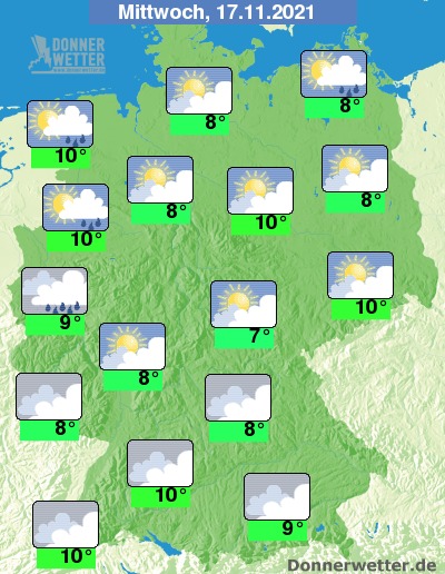 Am Mittwoch ist es überwiegend stark bewölkt oder neblig-trüb, hier und da zeigen sich aber auch Auflockerungen, jedoch ist ebenso etwas Regen möglich. An den Küsten bilden sich zudem einzelne Schauer. Die Temperatur erreicht 7 Grad in Erfurt und bis 10 Grad in Stuttgart. An den Küsten weht ein oft stürmischer Wind.
