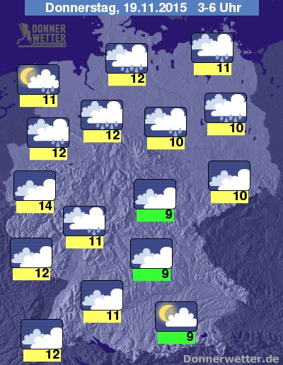 In der Nacht zum Donnerstag fällt zunächst über der Nordhälfte unter dichten Wolken zum Teil kräftiger Regen. Weiter nach Süden hin ist es zunächst noch trocken und teils aufgelockert bewölkt, im weiteren Verlauf erreichen die Regenwolken aber auch den Norden von Bayern und Baden-Württemberg. Gegen Morgen lassen die Niederschläge im Norden und Westen hingegen nach und gebietsweise kann es auch auflockern. Die Temperatur sinkt auf 14 Grad in Aachen und bis 9 Grad im München. Es weht verbreitet starker, teils auch stürmischer Wind, an der Nordsee herrscht Sturm mit möglichen Orkanböen.