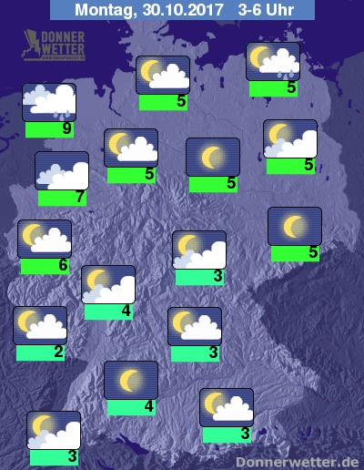 In der kommenden Nacht lockert und klart der Himmel häufig auf, besonders an den Küsten ziehen jedoch noch oft dichte Wolken durch, die hier einzelne Schauer bringen können, sonst bleibt es dagegen weitgehend trocken. Die Temperatur sinkt auf 9 Grad in Emden und bis 2 Grad im Saargau. An den Küsten weht ein starker und teils noch stürmischer Wind.