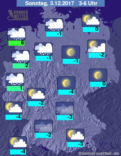 In der Nacht zum Sonntag breiten sich aus Nordwesten dichte Wolken mit Schnee, Schneeregen und Regen weiter Richtung Landesinnere aus, dazu muss mit erheblicher Straßenglätte gerechnet werden! Über der Südosthälfte bleibt es bis zum Morgen meist sternenklar und dazu trocken. Die Temperatur sinkt auf 6 Grad in Emden und bis -4 Grad am Pfälzer Wald.