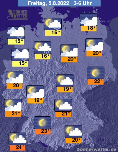 In der kommenden Nacht ist es über dem Süden Deutschlands und über Sachsen meist sternenklar, gegen Morgen nimmt hier die Bewölkung etwas zu, dabei bleibt es trocken. Im übrigen Land ziehen von Nordwesten her oft viele und teils dichte Wolken durch und es können sich vom Westen, über den Nordwesten bis in den Norden gebietsweise Schauer, örtlich auch Gewitter bilden. Im übrigen Land ist es aufgelockert bis stark bewölkt und dazu weitgehend trocken. Die Temperatur sinkt auf sehr warme 24 Grad in Freiburg und bis 15 Grad in Meppen.
