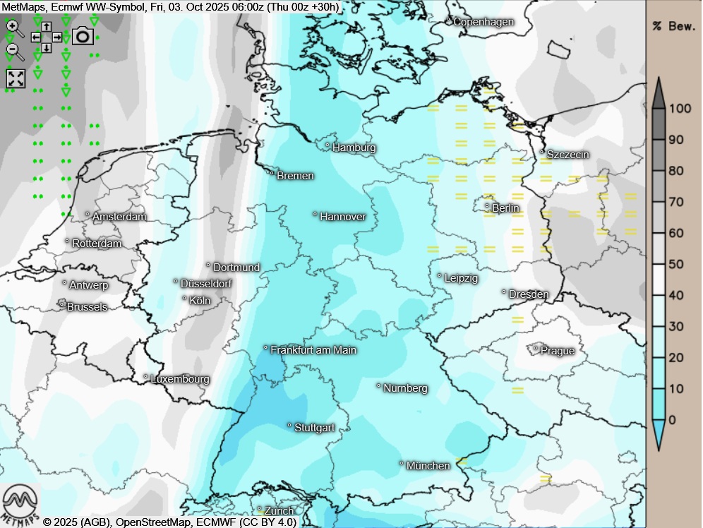 Am Freitag zeigt sich der Himmel über der Westhälfte wechselnd oder stark bewölkt, es bleibt aber meist trocken. Über der Osthälfte scheint am Feiertag nach Nebelauflösung vielfach die Sonne von einem wolkenlosen Himmel.