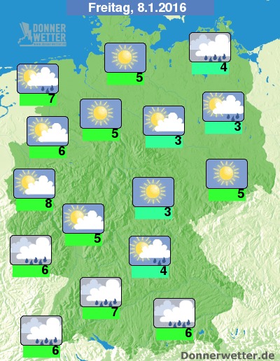 Am Freitag halten sich anfangs im Nord- und Ostseeumfeld, sowie im Nordosten noch dichte Wolken aus denen es zeitweise regnen kann, im Tagesverlauf klingen die Niederschläge hier jedoch meist ab und die Wolken lockern oft auf. Im übrigen Bundesgebiet ist es zunächst meist heiter bis sonnig, im Süden auch schon oft stark bewölkt, aber anfangs weitgehend trocken. Im Süden kommen im Tagesverlauf jedoch dichte Wolken und zeitweise Regen auf. Die Temperatur steigt auf 3 Grad in Magdeburg und bis 8 Grad in Bonn. Im Norden weht verbreitet starker bis stürmischer Wind, dabei sind auch Sturmböen möglich. An der See und auf den Bergen herrscht oft Sturm.