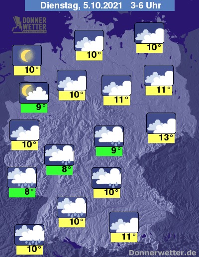 In der Nacht zum Dienstag ist der Himmel zum Großteil wolkenverhangen, lediglich im Nordwesten zeigt sich der Himmel mehrheitlich locker bewölkt oder sternenklar. In einem sehr breiten Streifen vom Südwesten Deutschlands, über die Mitte bis in den Osten des Landes fällt zeitweise Regen. Im übrigen Land bleibt es weitgehend trocken. Die Temperatur sinkt auf 13 Grad in der Lausitz und bis 8 Grad im Saargau.