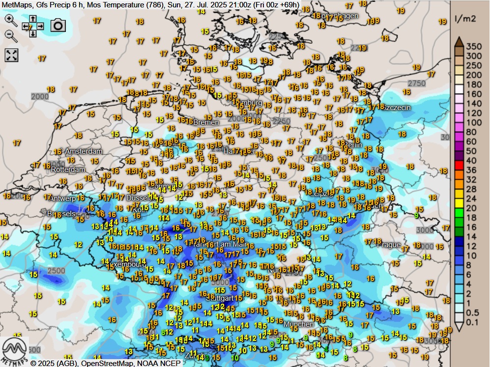 Am Sonntagnachmittag ist der Himmel meist wechselnd oder stark bewölkt, an den Küsten kann sich am Nachmittag auch mal längere Zeit die Sonne zeigen. Dabei ziehen von West nach Ost Schauer und Gewitter durch, auch im Süden muss am Nachmittag immmer wieder mit teils ergiebigem Regen gerechnet werden. Weitgehend trocken bleiben die Nachmittagsstunden im Nordwesten.