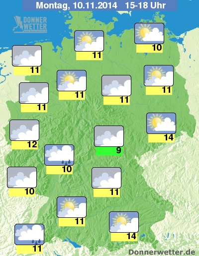 Heute Nachmittag ziehen verbreitet viele Wolken durch, dabei kann sich vor allem in der Osthälfte des Landes aber auch immer wieder mal die Sonne blicken lassen und es bleibt hier weitgehend trocken. In einem breiten Streifen von der Nordsee, über das westliche Niedersachsen, NRW, Rheinland-Pfalz, das Saarland bis nach Baden-Württemberg halten sich dagegen zumeist dichte Wolken aus denen hier und da auch Regen fällt. Die Temperatur liegt bei 9 Grad am Odenwald und bis 14 Grad in Berchtesgaden.