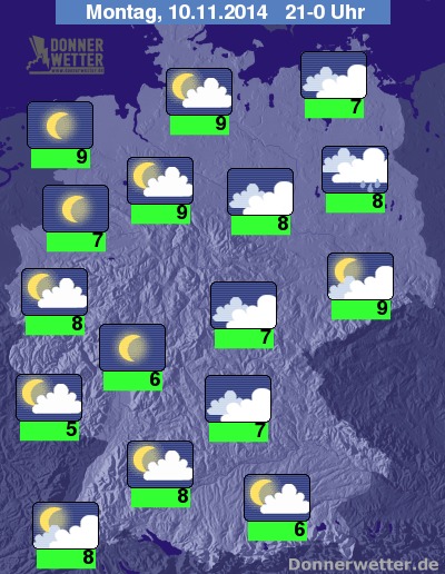 Heute Abend reißt der Himmel im Westen und Nordwesten verbreitet auf und die Sterne kommen zum Vorschein, dazu bleibt es trocken, jedoch kann sich hier und da Nebel oder Hochnebel bilden. Weiter nach Osten und Südosten bleibt es bei aufgelockerter bis dichter Bewölkung weitgehend trocken. Die Abendtemperatur liegt bei 9 Grad in der Lausitz und etwa 5 Grad in der Eifel.
